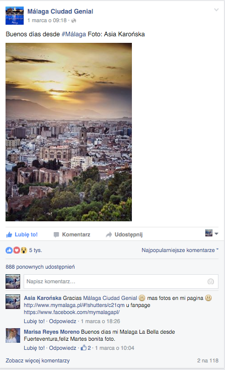 Zdjecie MyMalaga na oficjalnym profilu Malagi uzyskalo 5tys polubien :)Asia Karońska2 mar 20161 minut(y) czytaniaNic tak nie cieszy, jak wyróżnienie zdjęć na oficjalnym fanpagu Malagi 😄🎉🎈🎊😍